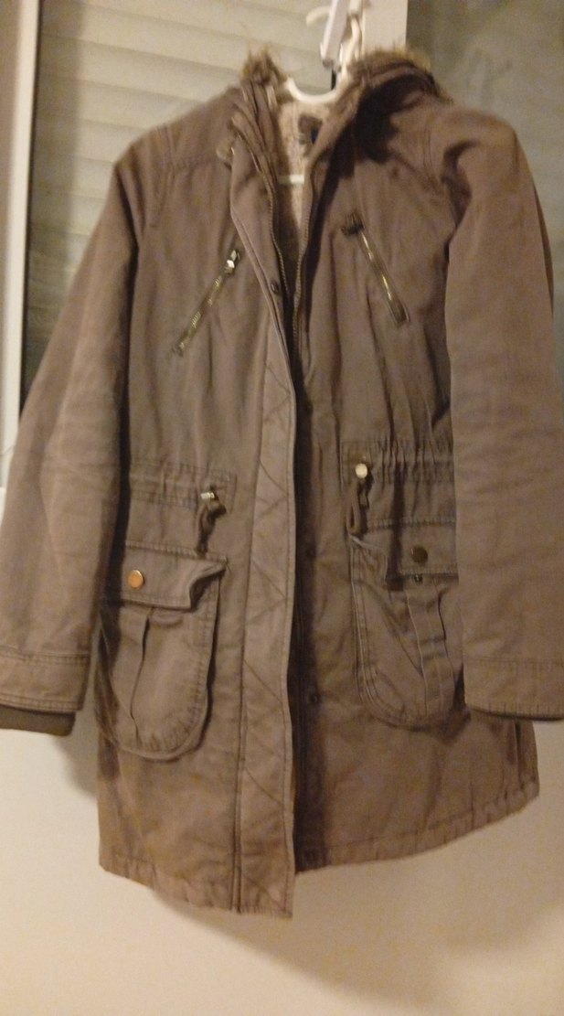 Düğmeli, kahverengi süet ceket, yakalı ve bol kesimdir. Uzun kollu, cepli ve günlük kullanıma uygundur.