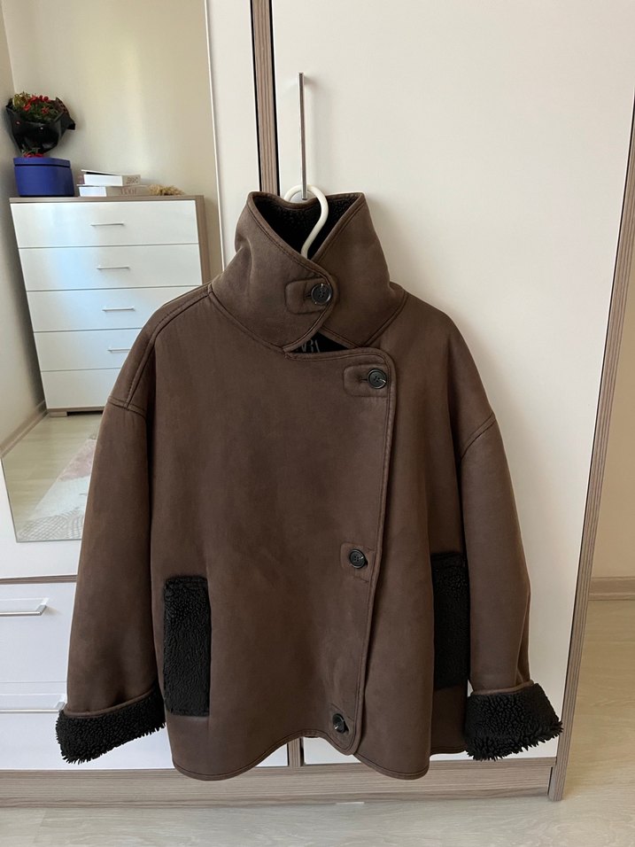 Kahverengi süet ceket, düğmeli ve kesik yakalıdır. Uzun kollu, rahat kesim ve midi boyda, cepli ve konforlu dokulu manşetlere sahiptir.