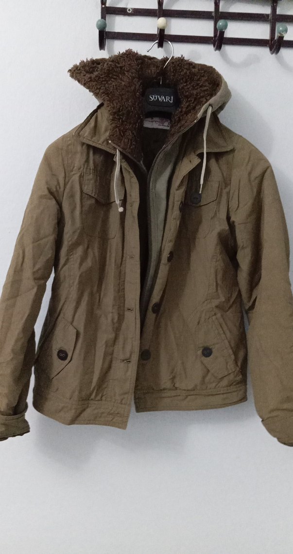 Düğmeli, kahverengi süet kumaştan, normal boyda ve rahat kesim kadın ceket. Uzun kollu, yaka detaylı ve içi sıcak tutan astarlı.