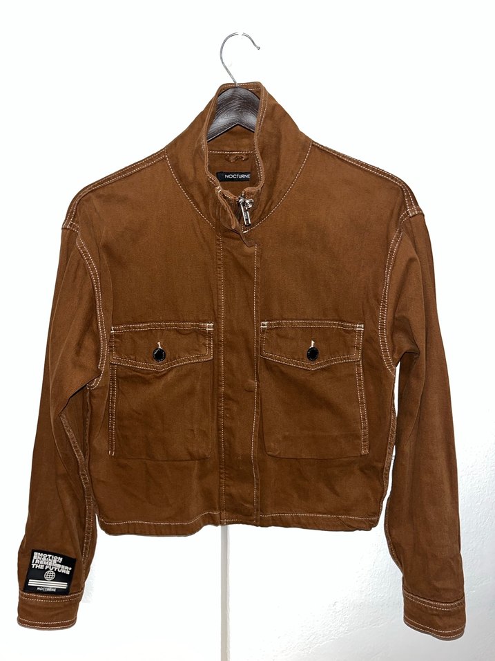 Kahverengi süet kadın ceket, düğmeli ön, kesik yaka ve uzun kolludur. Gevşek kesim, normal boyda, iki ön cep içerir. Günlük kullanıma uygundur.