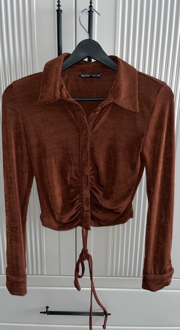 Uzun kollu, düğmeli ve yakalı kahverengi süet kumaştan yapılmış, vücuda oturan kadın gömleği. Ön kısmı büzgülü ve bağcıklıdır, ofis kullanımı için uygundur.