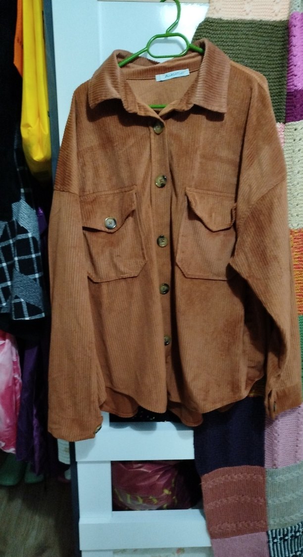 Kahverengi süet kadın gömlek, uzun kollu, düğmeli ve notlu yaka detaylıdır. Bol kesim, midi boy ve iki ön cepli, günlük rahat sokak stili için uygundur.