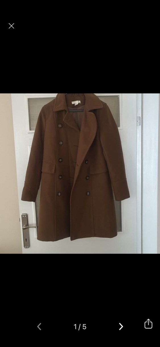 Kahverengi süet kumaştan, düğmeli, uzun kollu ve normal kesim midi uzunluğunda klasik tarzda kadın kaban. Ofis kullanımı için uygundur.