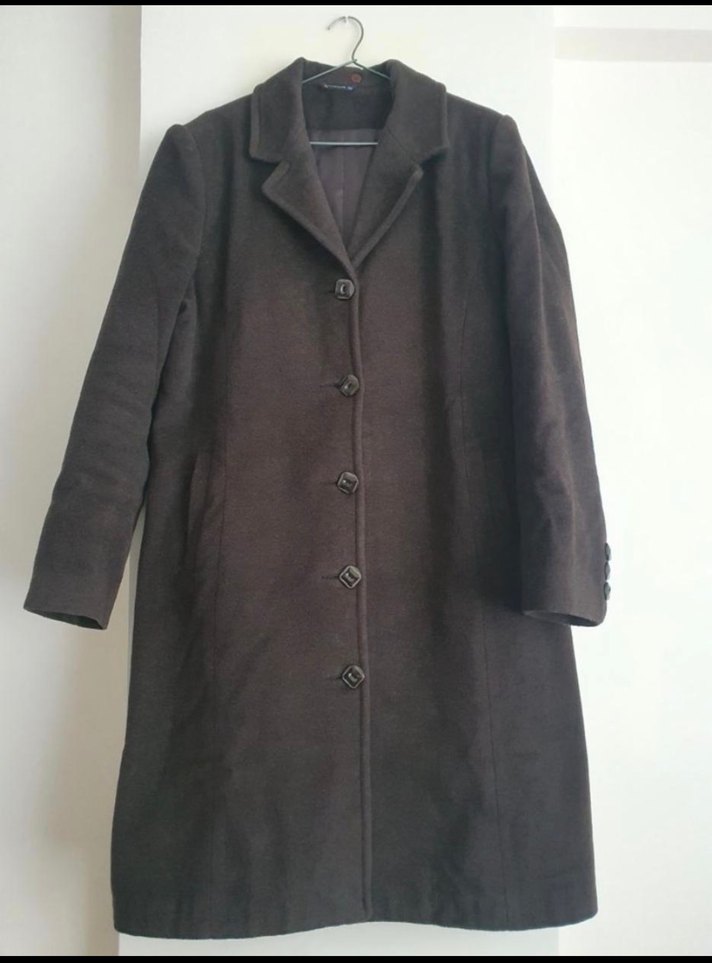 Uzun kahverengi kadın kaban, düğmeli ve kesimli yaka detayına sahiptir. Yumuşak süetten yapılmış, klasik goth tarzında, ofis için uygun, regular fit ve uzun kolludur.