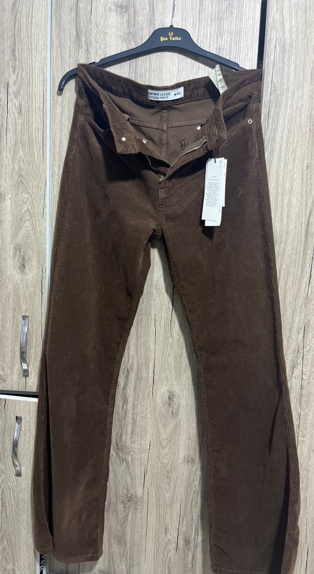 Düğmeli, kahverengi süet kadın kot pantolon, regular fit ve midi boydadır. Günlük kullanım için uygun, sokak stiline uygun rahat bir modeldir.