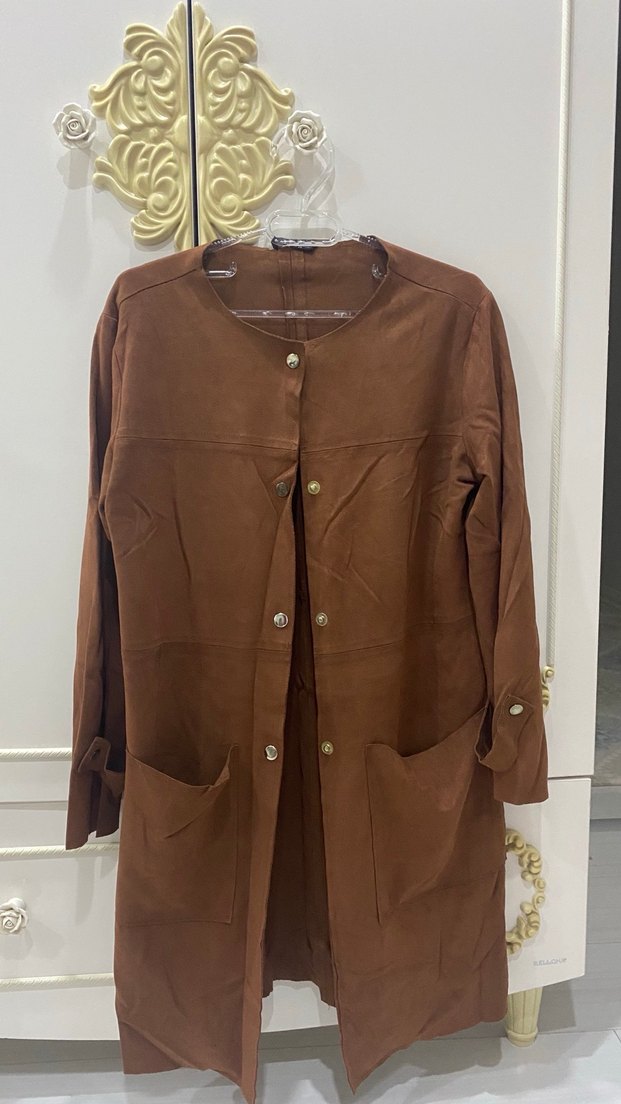 Düğmeli çıtçıtlı ön kısmı, uzun kollu ve kesik yakalı kahverengi süet uzun trenç . Regular kesim ve iki ön cepli, minimalist ve trend günlük sokak stili için uygun.
