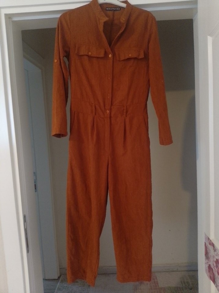 Kadınlar için düğmeli, kahverengi süet uzun tulum. Notlu yaka ve uzun kollu, rahat kesim ile günlük kullanıma uygun. S/M beden
