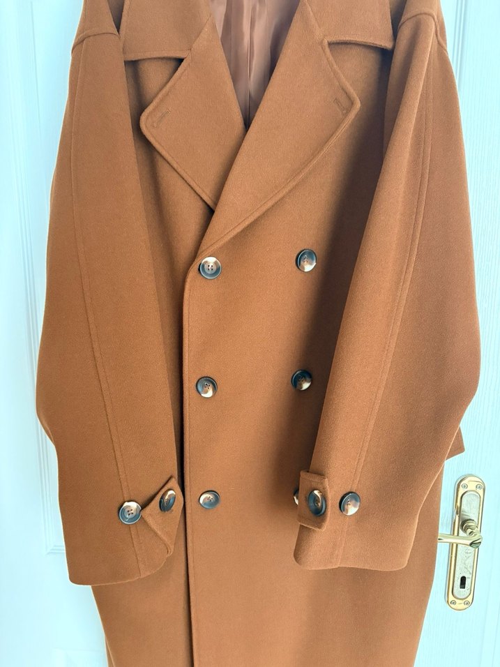 Bu uzun kahverengi süet kadın kabanı, düğmeli ön ve keskin yakaya sahiptir. Uzun kollu, parlak dokulu ve rahat kesimlidir. %30 yün içeriyor, Beyoğlu marka. Sadece 2 kere giyildi . M beden oversize