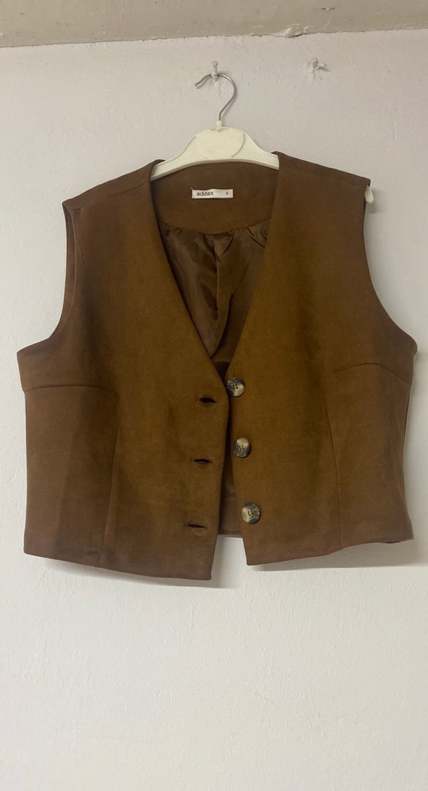 Kahverengi süet kadın yelek, düğmeli ve kesik yaka detaylıdır. Kolsuz, kısa ve regular fit tasarımıyla günlük sokak stiline uygundur. Minimalist ve koyu renklidir.