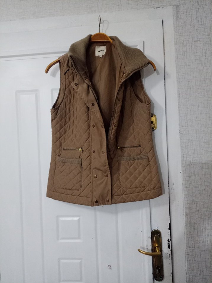 Kahverengi süet, düğmeli ve yakalı kadın yelek. İki fermuarlı cepli, normal kesim ve rahat günlük kullanım için uygundur. sadece iç fermuarı takarken zorluyor okadar