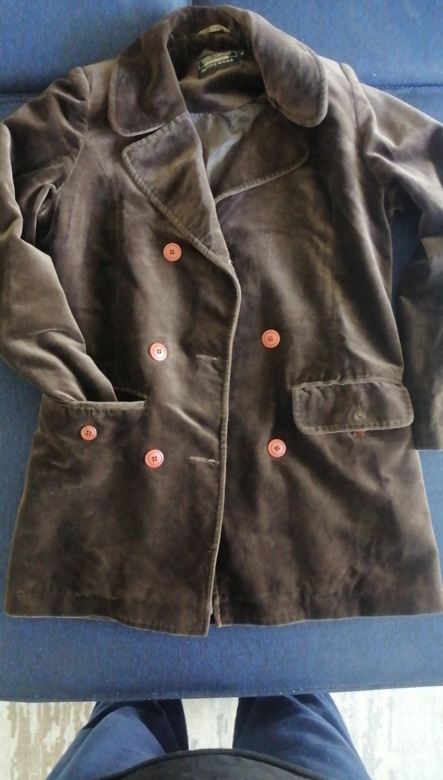 Düğmeli, kahverengi süet kumaştan yapılmış, normal uzunlukta midi kesim ve yaka kısmı kırmalı olan, uzun kollu, dar kesim bir ceket. Günlük sokak stili için uygundur.