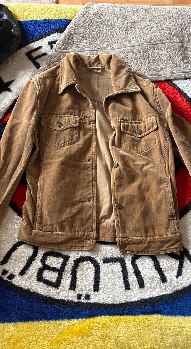 Kahverengi süet ceket, düğmeli önü, kesik yakası ve uzun kollu. Salaş kesim ve midi boy, trend sokak stili için uygun.
