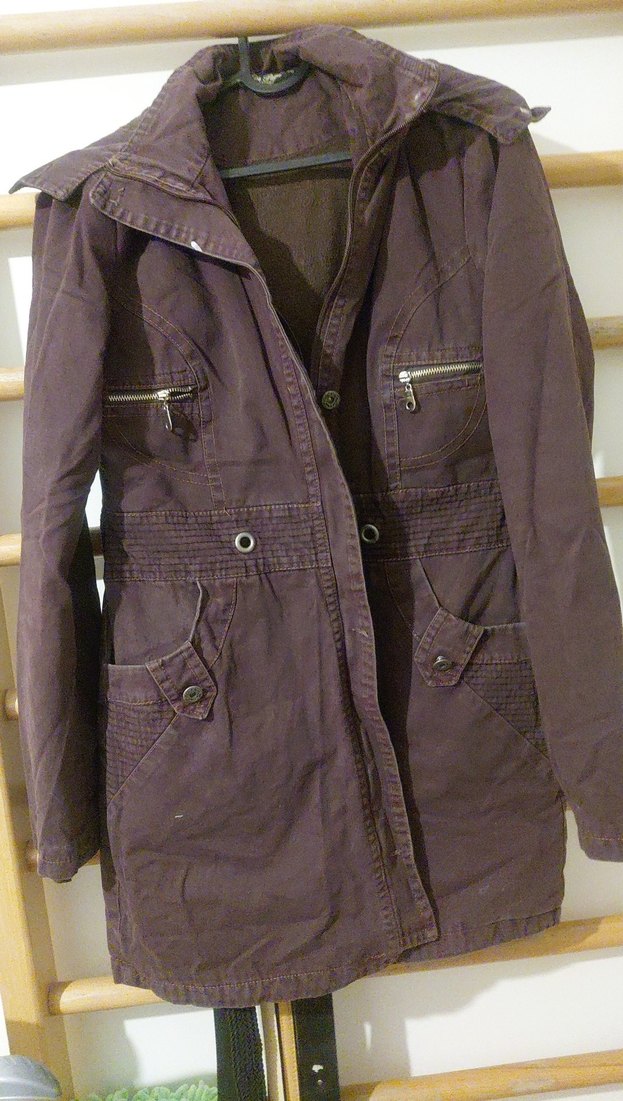 Kahverengi süet kumaştan, düğmeli ve çıtçıtlı, cep fermuarlı, uzun kollu, salaş kesim midi ceket. Sokak stiline uygun rahat bir model.