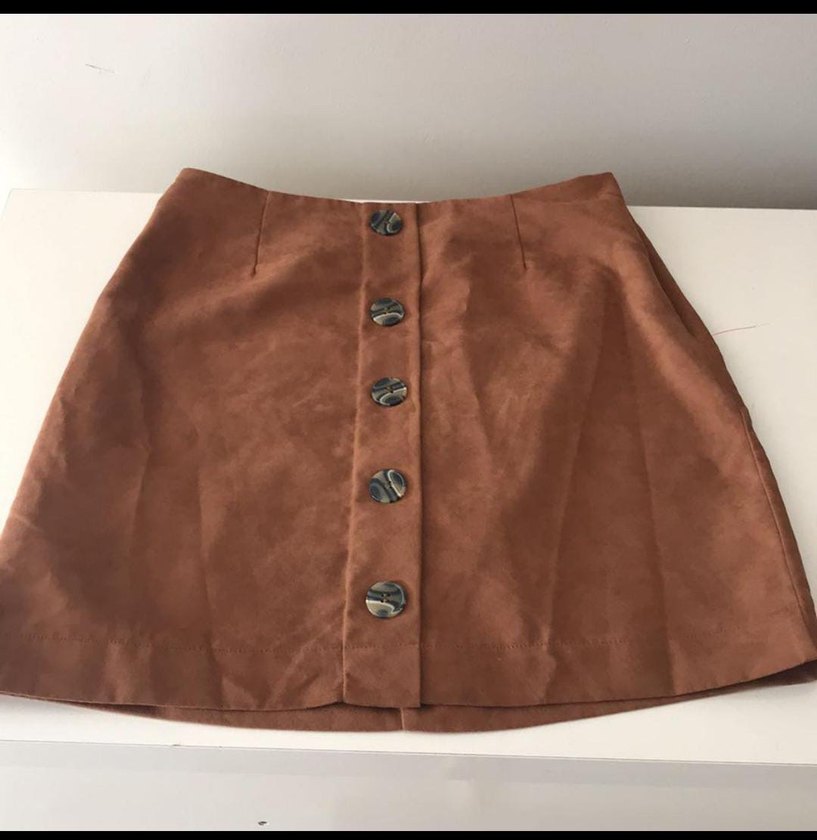 Önden düğmeli, yumuşak dokulu kahverengi süet midi etek. Bol kesimi ve bohem tarzıyla günlük kullanıma uygun.