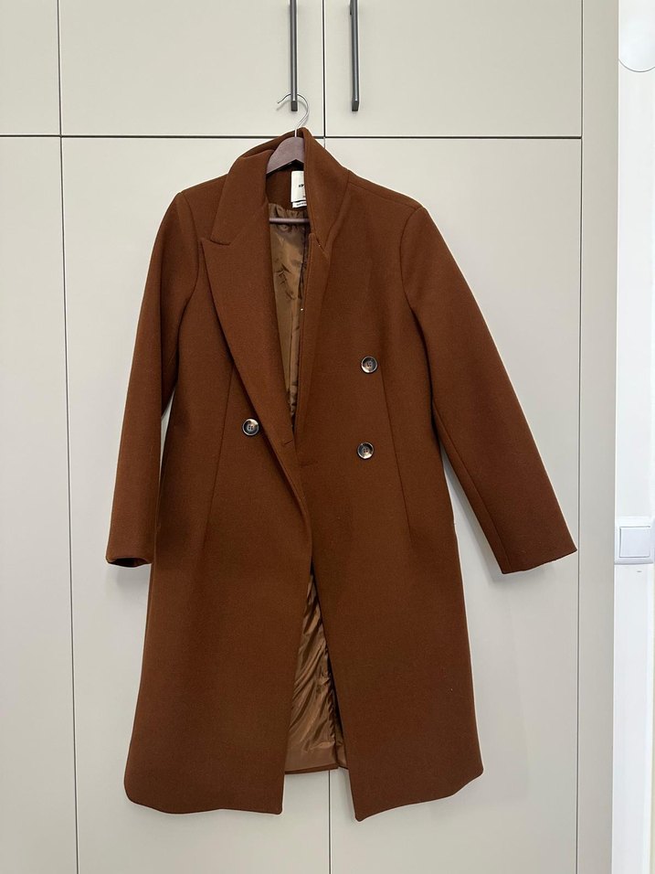 Kahverengi süet kaban, düğmeli ve notched yakalıdır. Normal uzunlukta, midi ve regular fit kesimlidir. Uzun kollu ve minimalist tasarıma sahiptir.