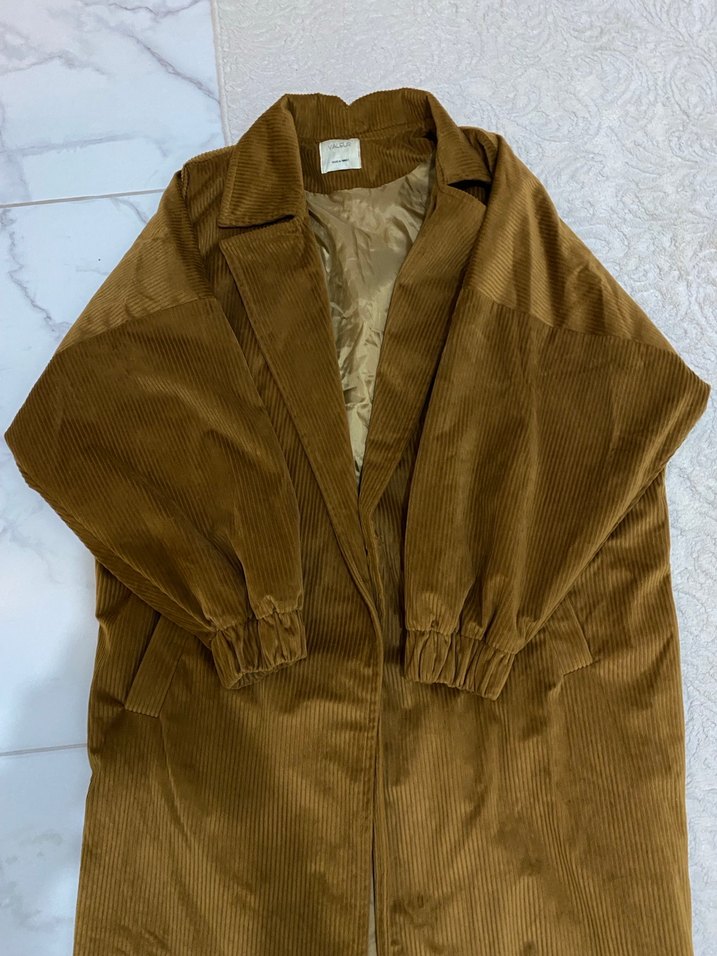 Kahverengi süet kumaştan, düğmeli ve kırlangıç yaka detaylı midi uzunlukta kadın kaban. Uzun kollu, bol kesim ve desen içermeyen rahat bir tasarıma sahiptir.