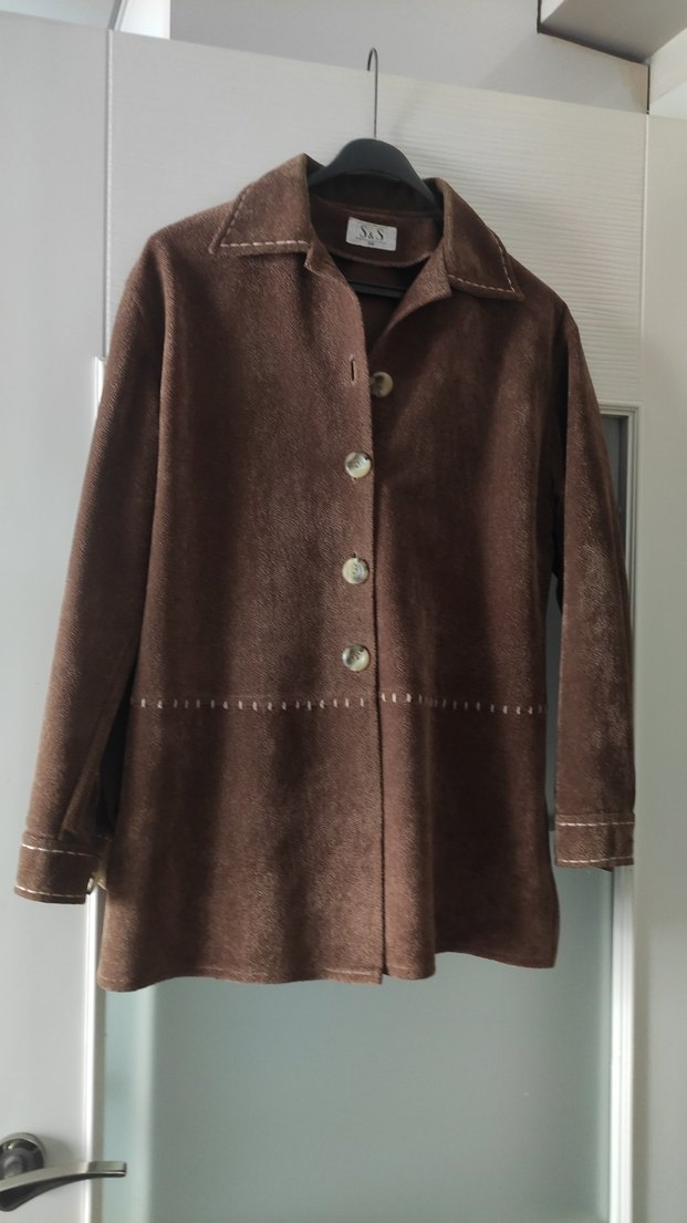 Kahverengi süet kumaştan, düğmeli, yakalı ve uzun kollu midi boy kadın kaban. Ofis ortamına uygun, bohem tarzda, normal kesim.38 beden 40 bedene olur