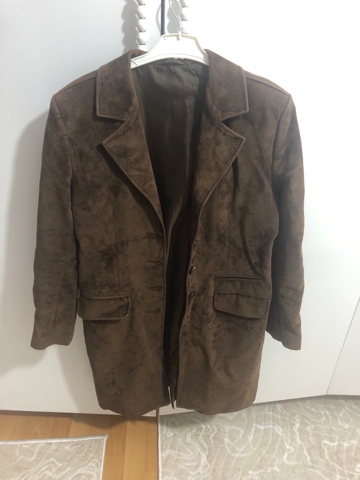 Kahverengi süet kaban, düğmeli bir düğmesi eksik ve notched yaka detaylarına sahiptir. Uzun kollu, midi boy ve regular fit olup ofis kullanımı için uygundur