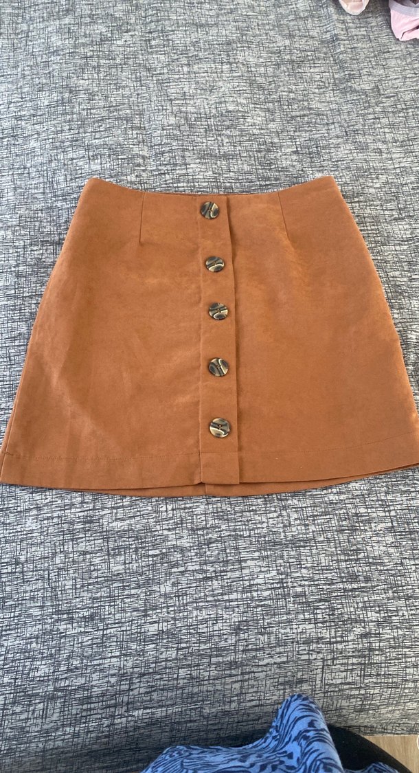 Düğmeli ön kısmı ve düz desenli kahverengi süet mini etek, rahat sokak stili için uygundur.