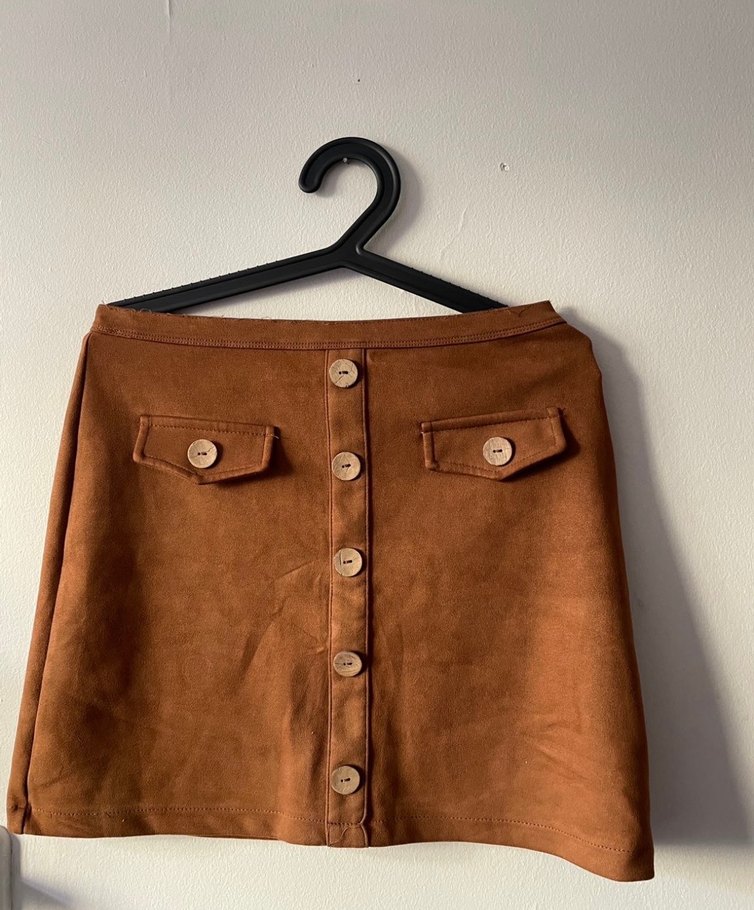Düğmeli ön kısmı ve iki küçük kapaklı cepli, kahverengi süet kumaştan yapılmış, bohem tarzda dar kesim mini etek. Günlük kullanım için uygun.