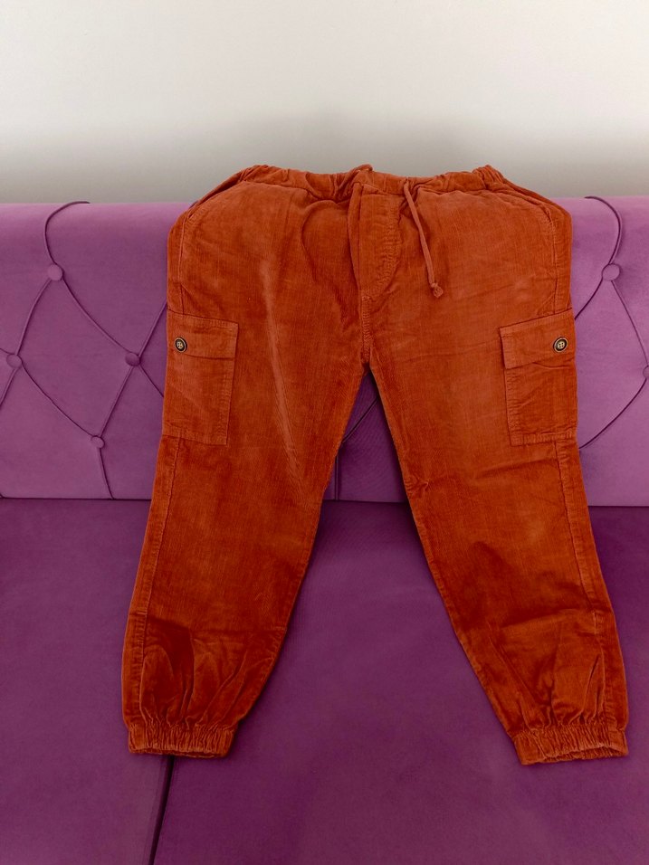 Düğmeli cepleri ve lastikli paçaları olan kahverengi süet pantolonu, rahat ve trend sokak stili için uygundur. Çok az giyildi pişman olmazsınız uyguna veriyorum