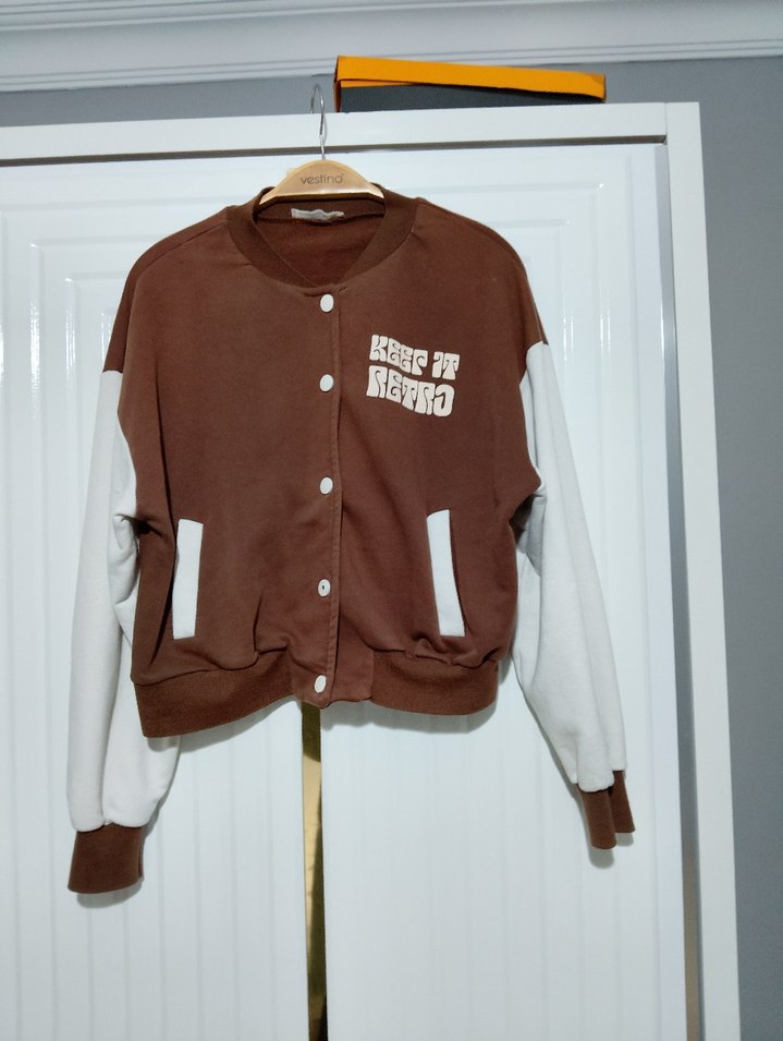 Düğmeli, uzun kollu, rahat kesim kahverengi sweatshirt ceket. Beyaz kollu, baskılı detaylı, yumuşak kumaştan yapılmıştır. Günlük rahat stil için uygundur. birtane digmesinde renk atması var onun haricinde hiçbir sıkıntısı yok görsele koydum pamuklu yüzde yüz butikten alındı