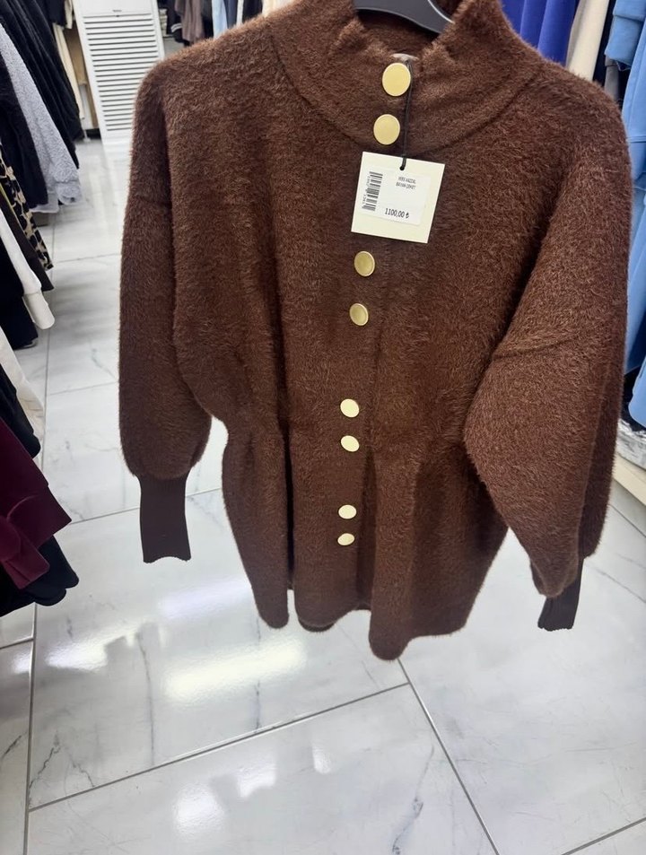 Bu kahverengi kadın yün kazağın uzun kollu, yuvarlak yakalı ve düğmeli detayları vardır. Rahat kesimiyle günlük kullanıma uygundur.