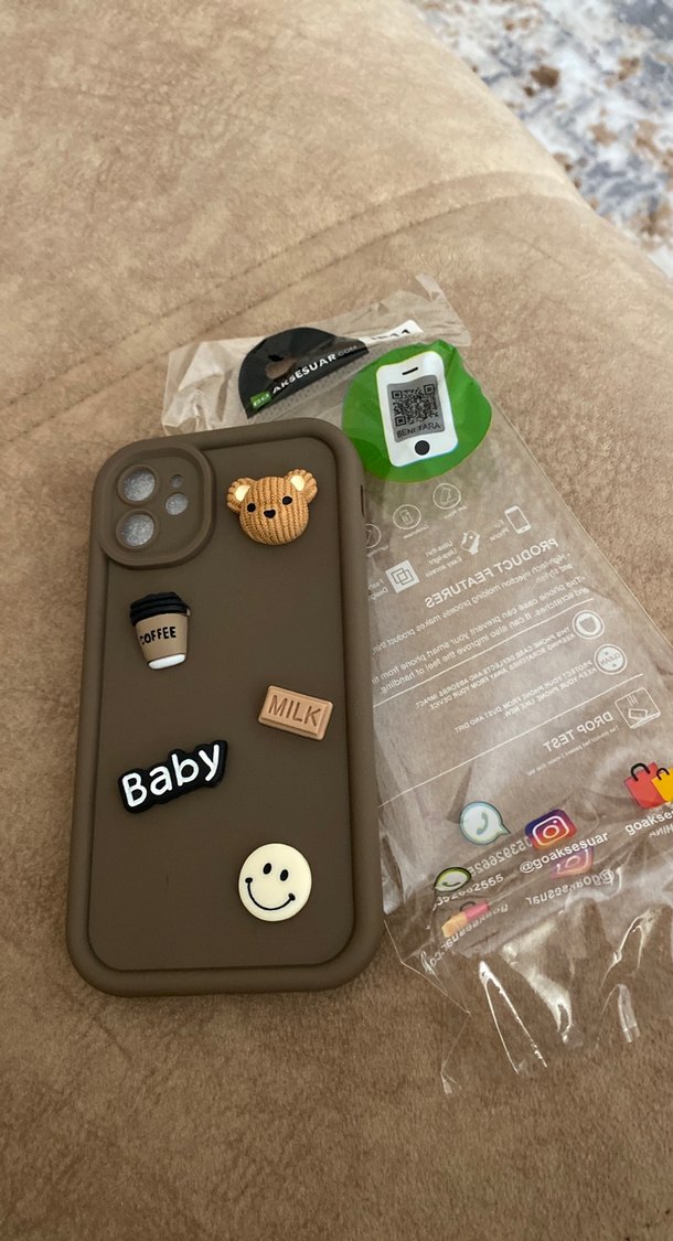 Düğmeli tasarıma sahip koyu kahverengi telefon kılıfı, ayıcık, kahve fincanı ve gülümseyen yüz gibi eğlenceli yamalar içerir. 'MILK' ve 'Baby' yazılı yamalar bulunmaktadır. Sıfır