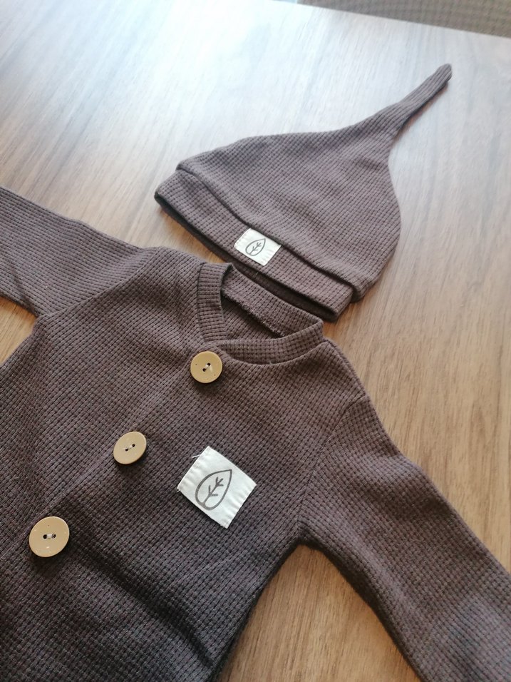 Uzun kollu, düğmeli kahverengi triko bebek takımı. Yaka kısmı kesimli ve baskılı detaylıdır. Şapka ile tamamlanmıştır.