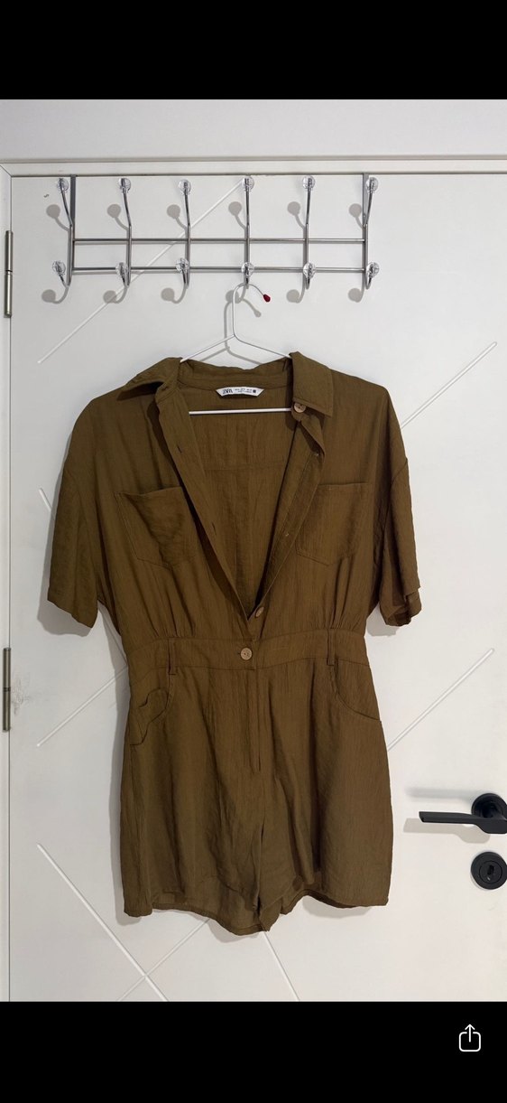 Keten kumaştan, kısa kollu, düğmeli ve notlu yaka detaylı kahverengi midi tulum, rahat kesimiyle günlük sokak tarzına uygun.