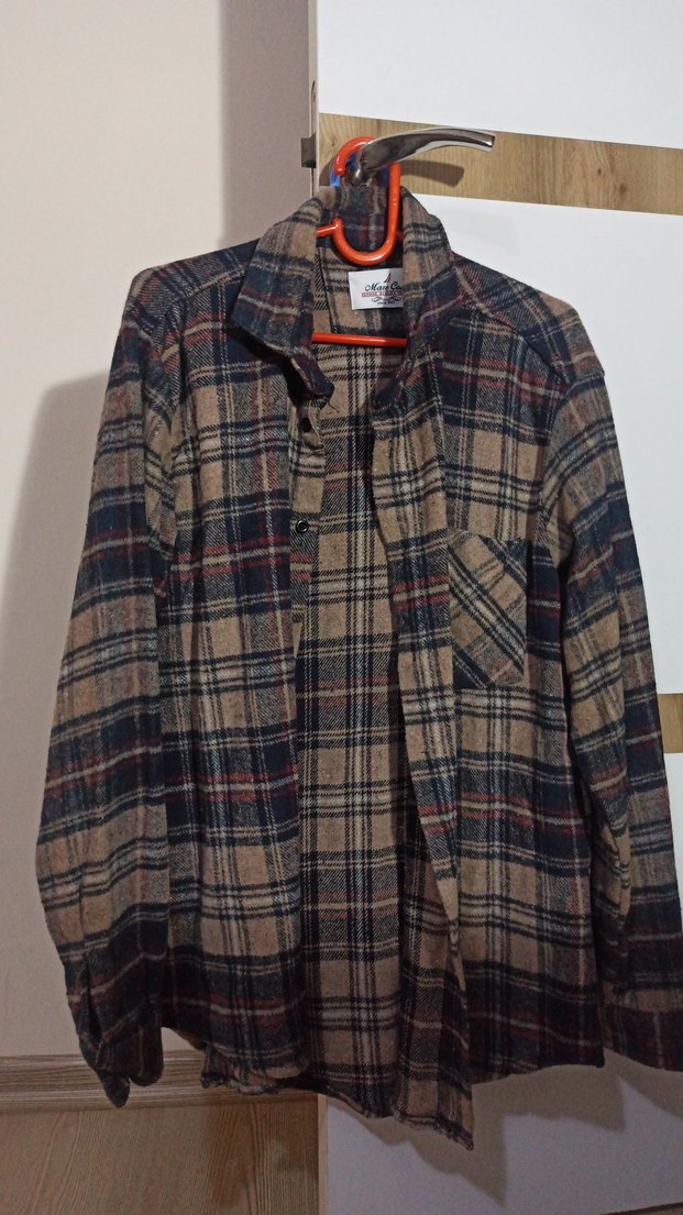 Düğmeli, bol kesim ve uzun kollu unisex gömleği. Yumuşak yün kumaştan, kahverengi tonlarında, notched lapel yakalı ve günlük kullanıma uygun. herhangi bir defosu yok hiç giyilmedi