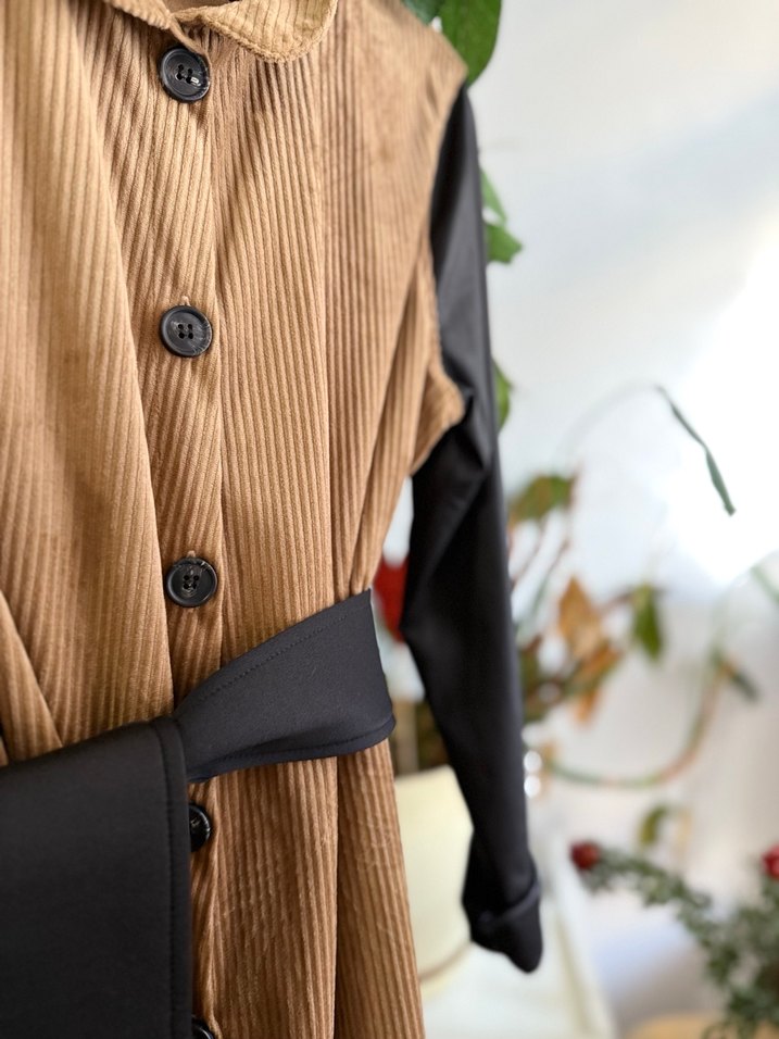 Kadife kolları ise suni deri kemer ile de kombin yapılır Düğmeli kahverengi uzun , yakalı ve düğme kapamalı. Strappy kollu, regular fit ve sentetik kumaştan üretilmiştir.