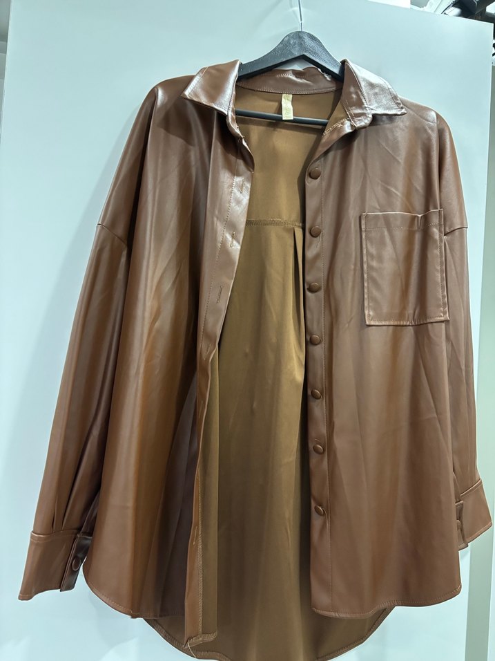 Bu uzun kahverengi deri ceket parlak yüzeyli ve düğmeli kapamalıdır. Salaş kesim, uzun kollu ve çentikli yaka detayına sahiptir.