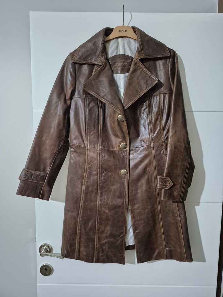 kahverengi uzun deri ceket. fit tasarıma en 45 uzunluğu 90 Günlük kullanıma uygun. düğmeleri mevcut omuzdan ölçüsü 40 cm