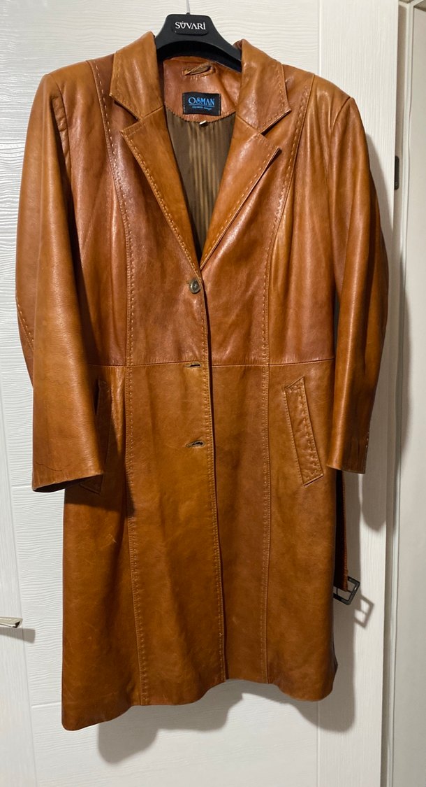 Kahverengi uzun deri kadın ceketi, düğmeli ve kesik yakalıdır. Uzun kollu ve normal kesim, ofis için uygundur. ✨