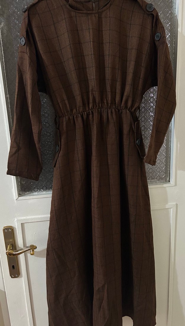 Kahverengi keten kumaştan yapılmış, düğmeli ve bol kesim uzun elbise. Uzun kollu, yakası kesikli ve ofis için vintage bohem tarzda.