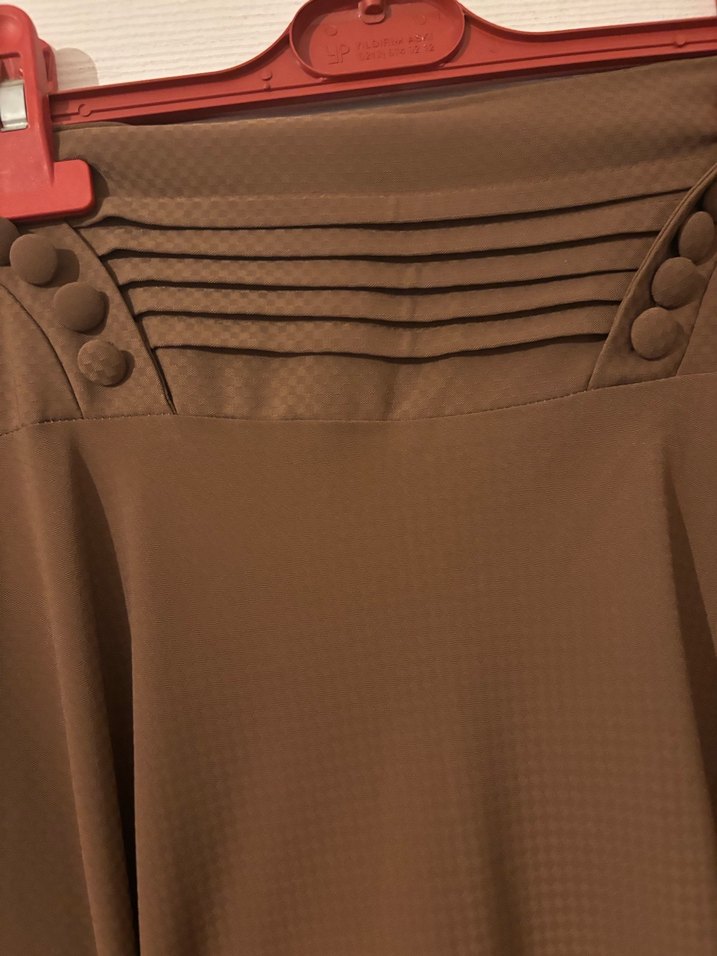 Kahverengi midi uzun etek, düğmeli detaylara ve rahat bir kesime sahiptir. Yumuşak sentetik kumaştan üretilmiş olup, normcore tarzıyla vintage bir ofis görünümüne uygundur.