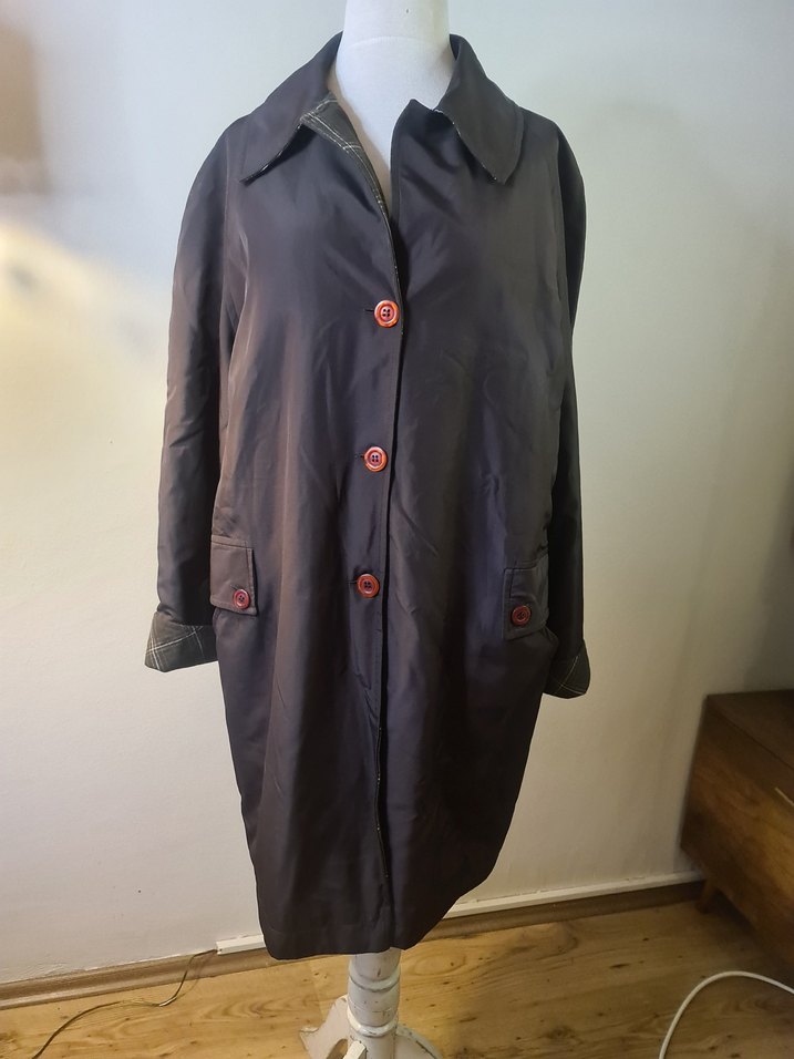Düğmeli, kahverengi uzun hamile kabanı, ipeksi kumaş ve geniş kesimle ofis kullanımı için uygundur.