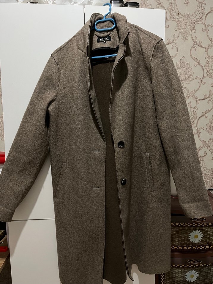 Düğmeli ve yan cepli, soğuk havalar için sıcak tutan kumaştan yapılmış kahverengi uzun kaban. Basit dik yakası ve düz kesimi vardır.