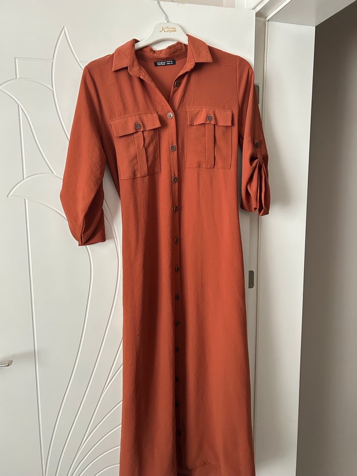 Kahverengi uzun elbise, düğmeli, uzun kollu ve notalı yakalıdır. Rahat kesimi ve yumuşak sentetik kumaşıyla günlük kullanıma uygundur.