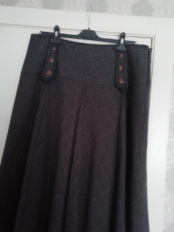 Düğmeli tasarıma sahip, kahverengi uzun ve bol kesim kadın eteği. Sentetik kumaştan, gotik ve Paris tarzı, ofis için uygun.