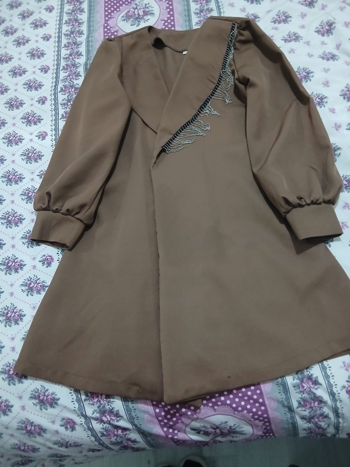 Düğmeli, kahverengi uzun kadın kabanı, bol kesim ve yakalıdır. Yumuşak sentetik kumaştan, uzun kollu ve desen içermeyen sokak stili için uygundur.