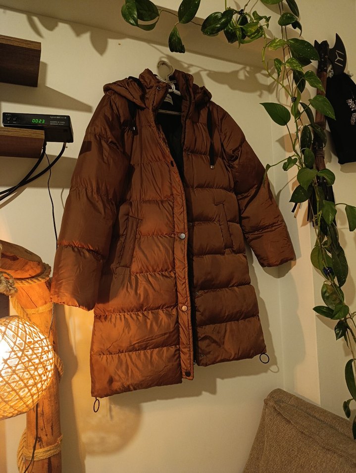 Uzunluk 85 iki koltuk arası 45 cmdir. Düğmeli ön ve kesik yaka detaylı kahverengi uzun kışlık mont. Gevşek kesim, uzun kollu ve yumuşak, sıcak kumaştan üretilmiştir. Trend sokak stili için uygun.