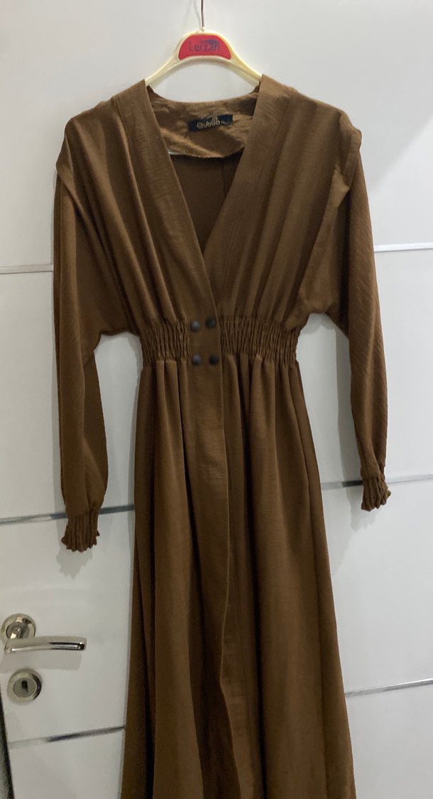 Kahverengi uzun keten elbise, V yaka, uzun kollu ve bol kesimdir. Düğmeli ve beli büzgülü, vintage sokak stilini yansıtır. Günlük kullanıma uygundur.
