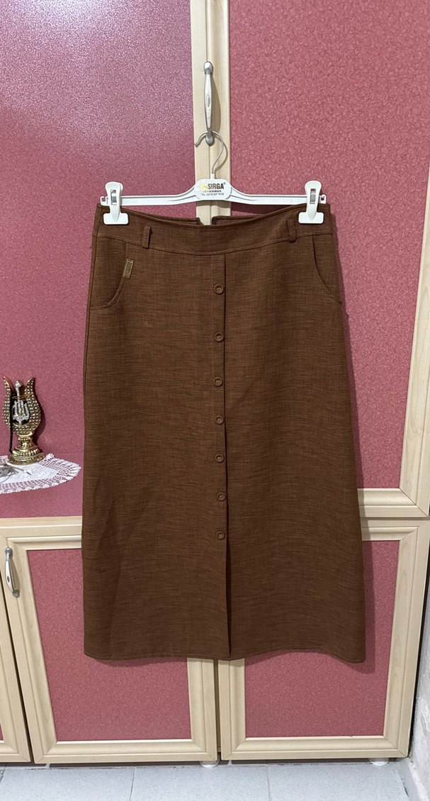 Düğmeli Kahverengi Uzun Keten Etek