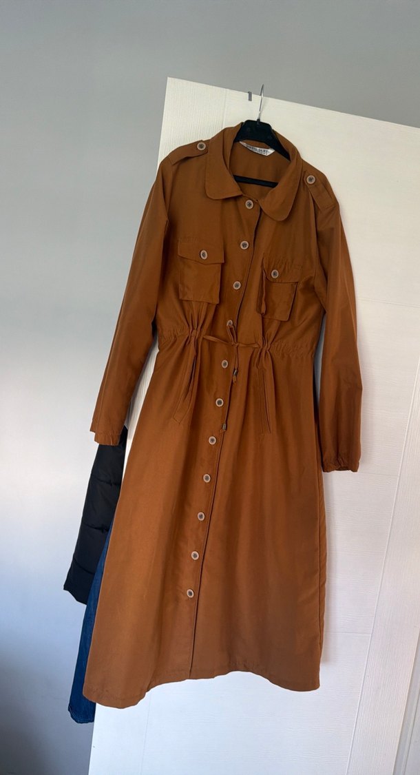 Keten kumaştan üretilmiş, düğmeli ve cepli kahverengi uzun trençkot. Salaş kesimi ve notalı yaka detayıyla günlük kullanıma uygun rahat bir stil sunar.