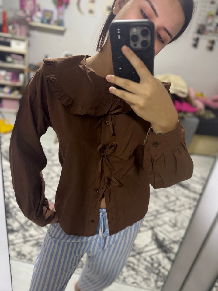 Düğmeli Kahverengi Uzun Kollu Bağcıklı Bluz