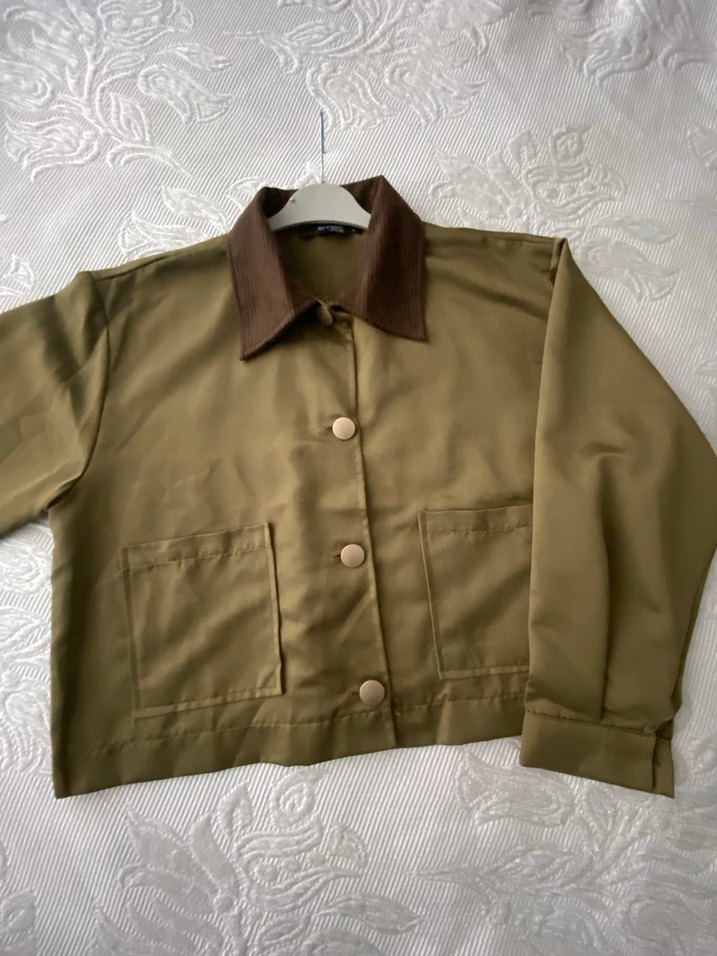 Düğmeli, kahverengi kadın ceketi; yakası açık, uzun kollu ve bol kesimdir.günlük kullanıma uygundur.