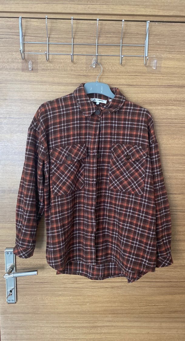 Kahverengi uzun kollu kadın gömlek, bol kesim ve yakalı, sentetik kumaştan, düğmeli ve göğüs cepli. Rahat sokak tarzına uygun.