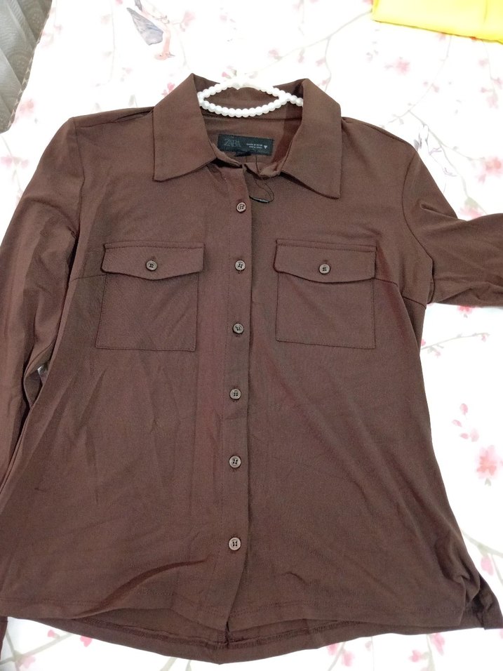 Kahverengi, düğmeli kadın gömlek, uzun kollu ve yakalıdır. Pamuk kumaştan, bol kesim ve günlük ile ofis kullanımı için uygundur. ürün sıfır orjinal Zara marka